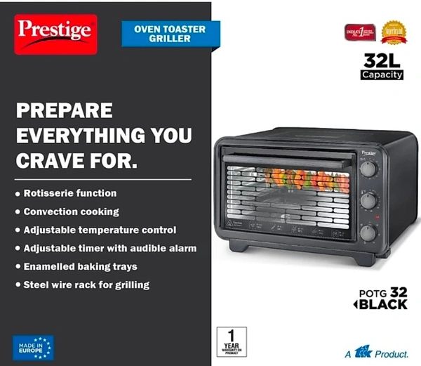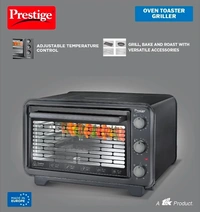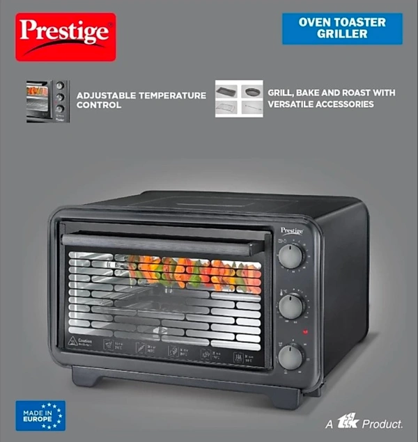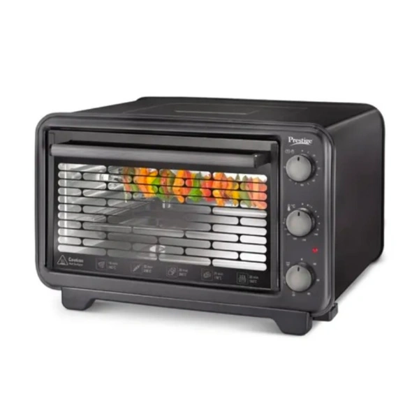 Prepare lip smacking delicacies like pizzas, tikkas, kebabs, cakes, breads, biscuits, parathas, baked vegetables, and much more with the Prestige Oven Toaster Grill. It's power packed with features like convection cooking for even cooking, full size glass door for better display, rotisserie function that makes cooking a blissful experience, and much more. It's time to experience the true joy of cooking. Specifications : Rotisserie Function Convection Cooking Adjustable Temperature Control Enamelled Baking Tray Round Baking Tray Steel Wire Rack Adjustable Timer With Audible