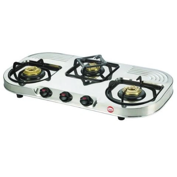 Gas stove type: Manual; Burner material: Brass; Size of the burner: 1-Small,1-Medium,1-Large; Material of the body: Stainless Steel; Material of the top: Stainless steel; Size of the gas stove (in cm): 81cm x 42 cm x 14 cm; Colour: Silver