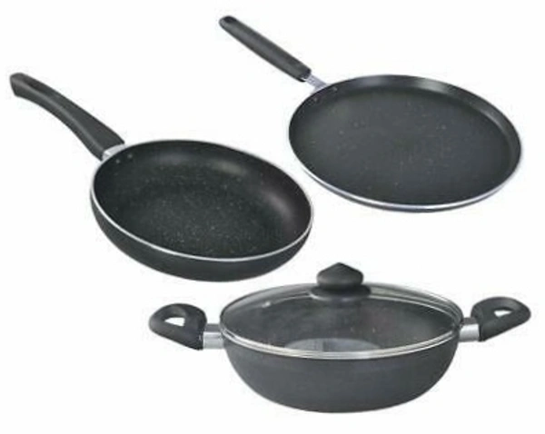 - Material: Non-stick Aluminium; Size: Tawa (25cm), Frypan (24cm) and Kadhai (24cm); Base type: Induction Base; Base thickness (in mm): 2.8; Included components: 1 Tawa, 1 Frypan and 1 Kadhai; Colour: Black