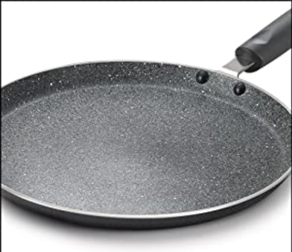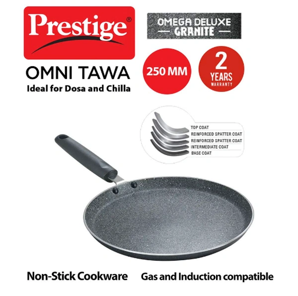 Features & details Nonstick aluminium tawa with durable granite-finish coating Metal spoon friendly Dishwasher safe Colour: Black, Material: Aluminium Package Contents: 1-piece Omega Deluxe Granite Omni Tawa (250mm) Warranty Information: 2 years