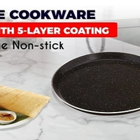 Features & details Nonstick aluminium tawa with durable granite-finish coating Metal spoon friendly Dishwasher safe Colour: Black, Material: Aluminium Package Contents: 1-piece Omega Deluxe Granite Omni Tawa (280mm) Warranty Information: 2 years